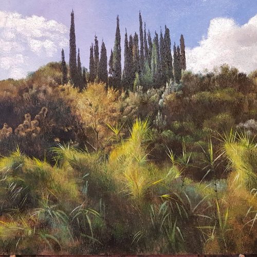 Angy LabirisThe COVID-19 pandemic has hit the world by surprise. We wonder when it will be over. There have been other epidemics but none that have forced us to change our normal behaviour to this extent. We all hope that we won’t see one again in our lifetime. We can no longer travel. We can’t go overseas – not even interstate. We are all housebound. We are isolated. We wait at home hoping that the virus will go away or will be conquered. We began to see improvement so we start little by little to behave again like normal human beings. We go out of the house, to a restaurant or for coffee. But things again change. We again retreat. Visual artists are still busy. The creative process continues in isolation. The virus has not stopped their work. I have continued to paint but, as outdoor activities are restricted, I have concentrated mainly on indoor subject matter. I painted a self-portrait contemplating the outdoor world. I set up indoor still life subjects or imagine the landscapes of Greece that I long to revisit.