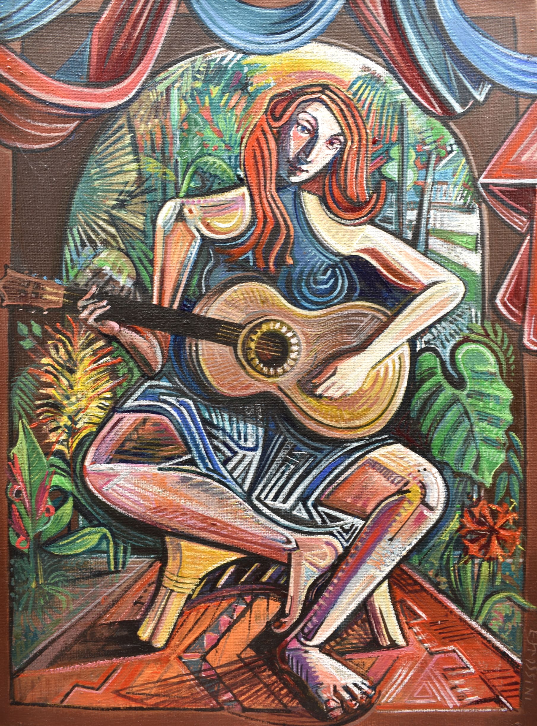 Efrossini ChaniotisSitting at my window of my 1st floor, one-bedroom, suburban apartment, I looked out onto the quiet road. Though I had a horizon to gaze upon, more often all I sensed was the close proximity of ‘concrete’ and the physical distance from being far away from everywhere else! My ‘inside’ and our collective lock down, inspired me to imagine idealized imagery of what existed outside, beyond Melbourne city. Art gives you the power to create whatever you desire and so that is all I did, non-stop. I escaped into imagery of strength and confidence, sensuality and innocence, independence and kinship, domestic and wild, inner space and expansive space, escape but not disconnection. My modern icons depict sensual, independent musicians with bare feet, with the outside natural world merging with the safety of home. To make the painting’s reality even closer, I painted the female subjects seated on the furniture and on rugs and surrounded by objects that also surround me, in my apartment.