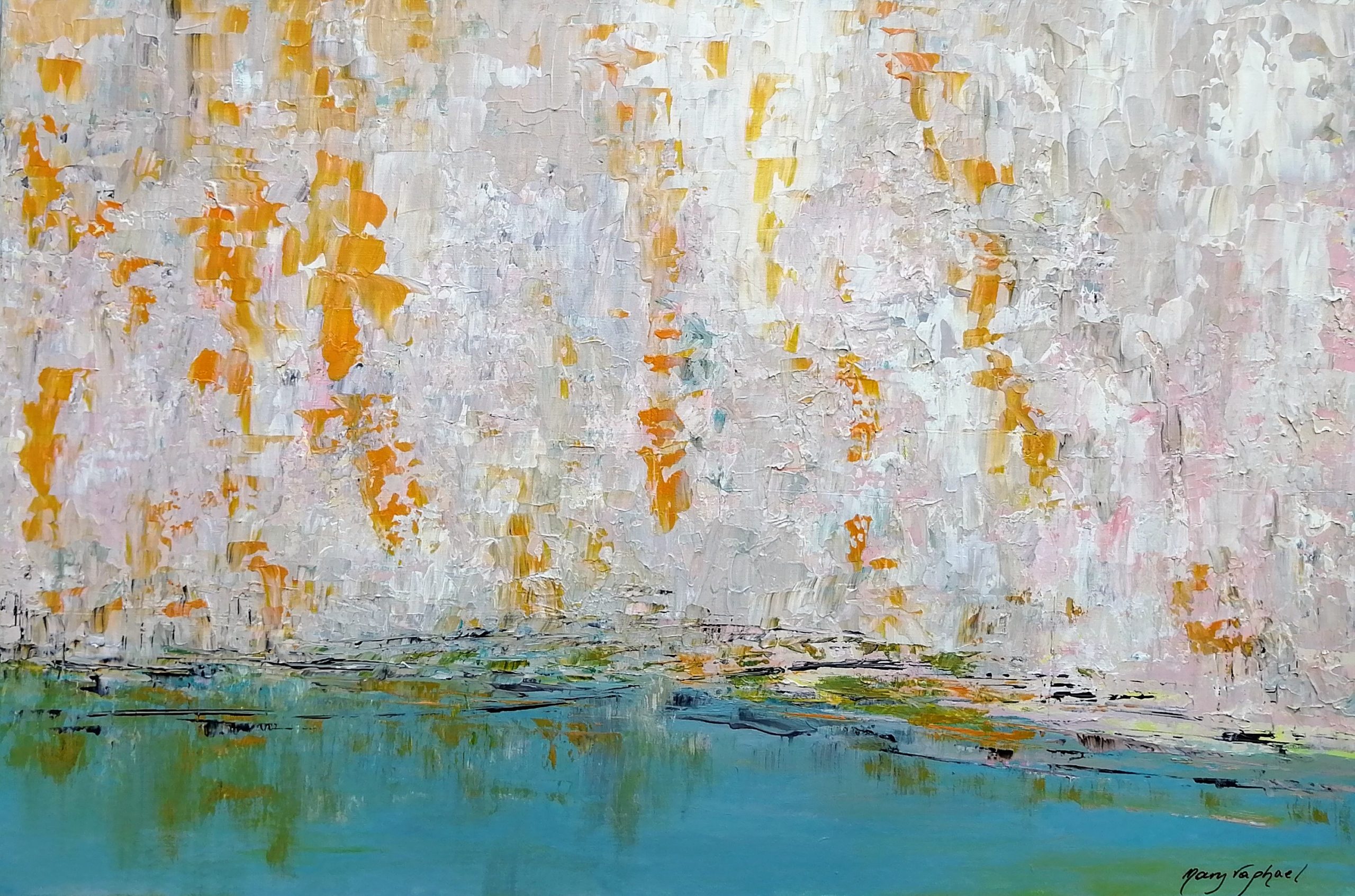 Mary RaphaelPandemic, lockdown, isolation… Covid-19 caught us unawares. Confusion, fear, anger, anxiety, so many changes in our everyday life. What is this? Where did it come from? How? Strange, so many questions and no answers. One day we have freedom, motivation, visits, dreams, plans. The next alone in the house. Days pass, more anxiety sets in. What do I need to do to keep me sane and help me get through these trying times? Difficult to feel creative right now. Important to focus on doing something, anything. I begin walking; through the park, down to the beach. People walking in the park, walking the dog. I hear laughter. Nature surrounds me. Green grass, blue sea, colour, space, energy, spirituality, inspire me to express this on canvas. How uplifting! Good thoughts return – my travels, my journey in life, my art, healing, wellness, freedom. Nature is my inspiration. Now I am motivated. Suddenly I need to paint.